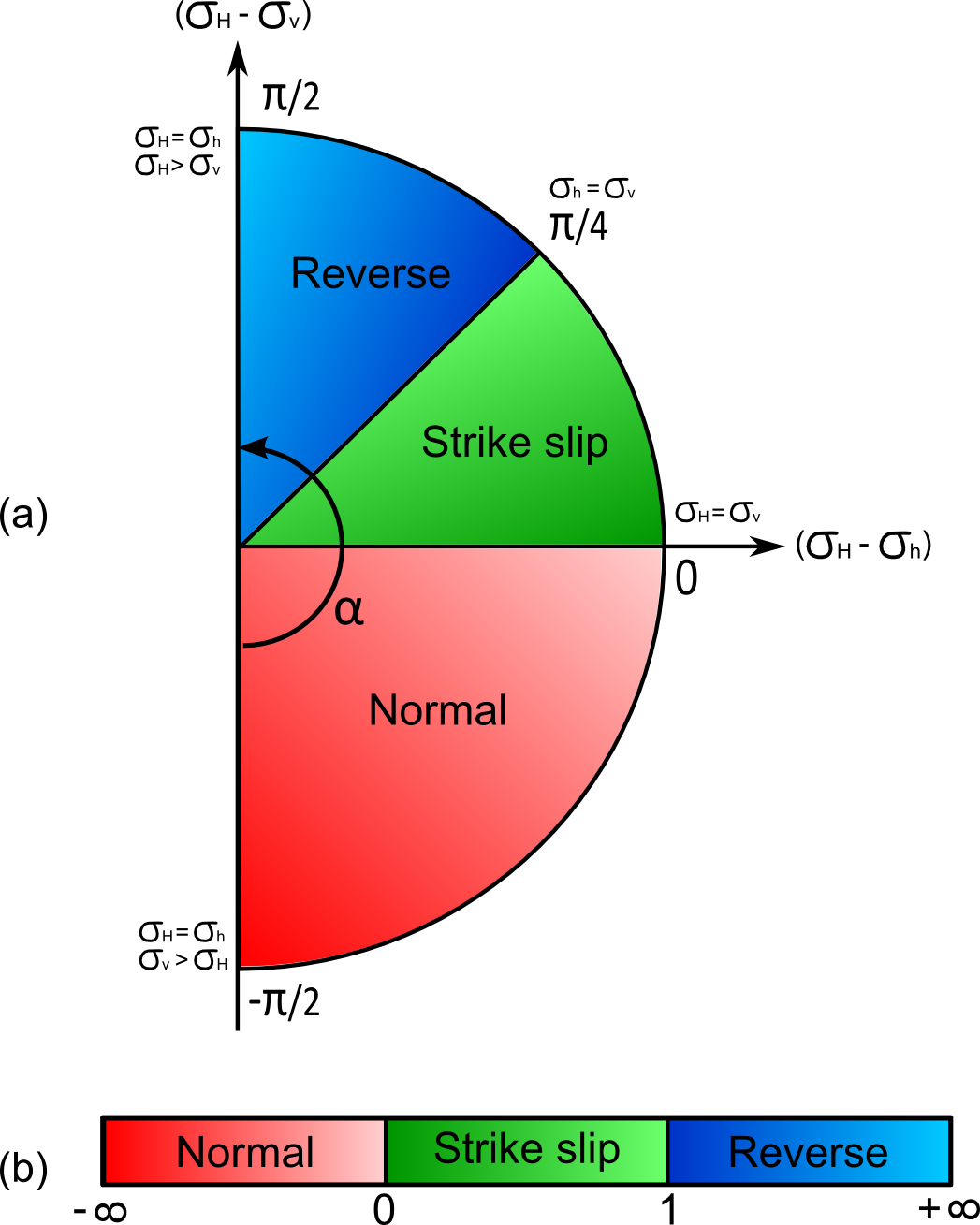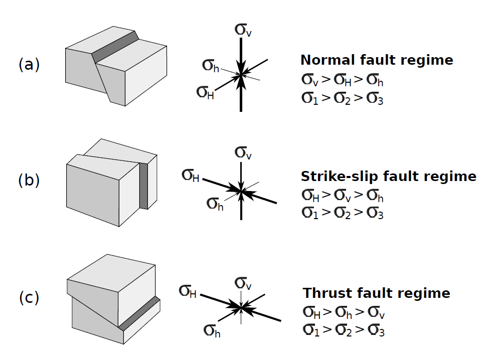 Depending on the magnitude of vertical stress compared to the other two axis (maximum, minimum, intermediate),