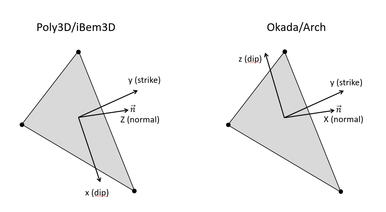 As opposed to Poly3D, we use the Okada convention where x-axis represents the normal direction of a triangular element, the y-axis the strike direction and the z-axis the dip-direction pointing upward for positive value: